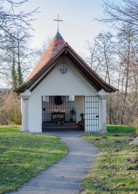 Die alte Kapelle stand an der Neupotzer Straße in der Nähe des Friedhofs, sozusagen „zwischen den Lebenden und den Toten“. Errichtet wurde sie dort auf Grund einer Stiftung der Anna Avril im Jahr 1858. Weil diese alte Kapelle schließlich baufällig war und zudem von Wohnungen und Betrieben umgeben, war ein neuer Standort in der Flur notwendig geworden.