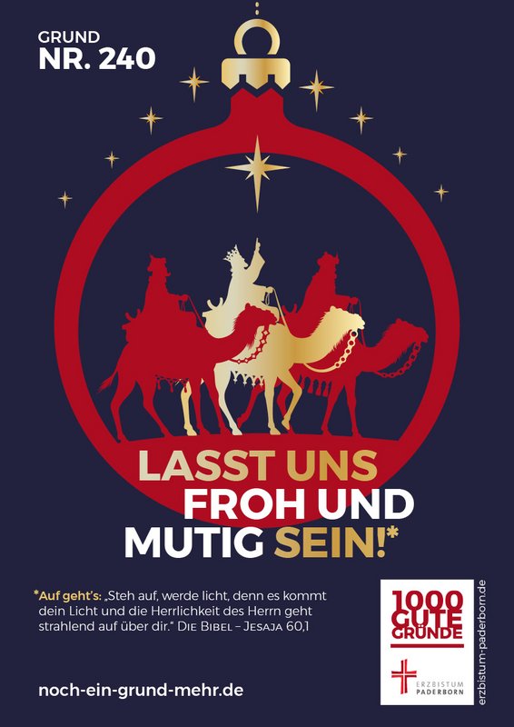 Die Initiative „1000 gute Gründe“ aus dem Erzbistum Paderborn bringt Argumente, interessante Zahlen, Funfacts und kleine Denkanstöße aus den unterschiedlichsten Bereichen des Lebens. Dazu zählen insbesondere auch gute Gründe für Gott, den Glauben und die Kirche. Das Repertoire reicht von Zusprüchen aus der Bibel über humorvolle Glaubenssätze bis zu ernsthaften Mutmachern.