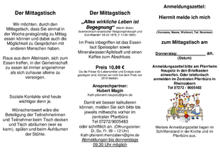 10 angemeldete Personen sollten es mindestens sein, damit wir den Seniorenmittagstisch weiter anbieten können. Die Termine des 1. Halbjahres 2026 finden sich auf dem Flyer, der in der Kirche und im Pfarrheim ausliegt. Auf der Homepage und in der PfarreiApp.