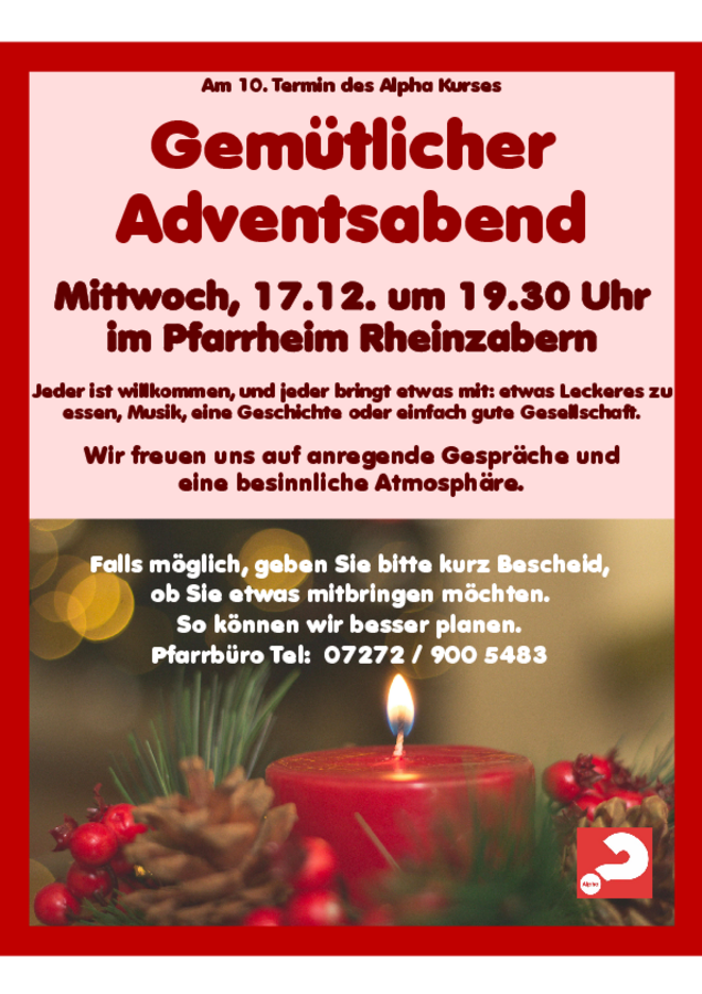 Die Adventszeit lädt uns ein, gemeinsam innezuhalten und die Vorfreude zu genießen. Deshalb laden wir herzlich am 10. Termin des Alpha Kurses zu einem gemütlichen Adventsabend ein: